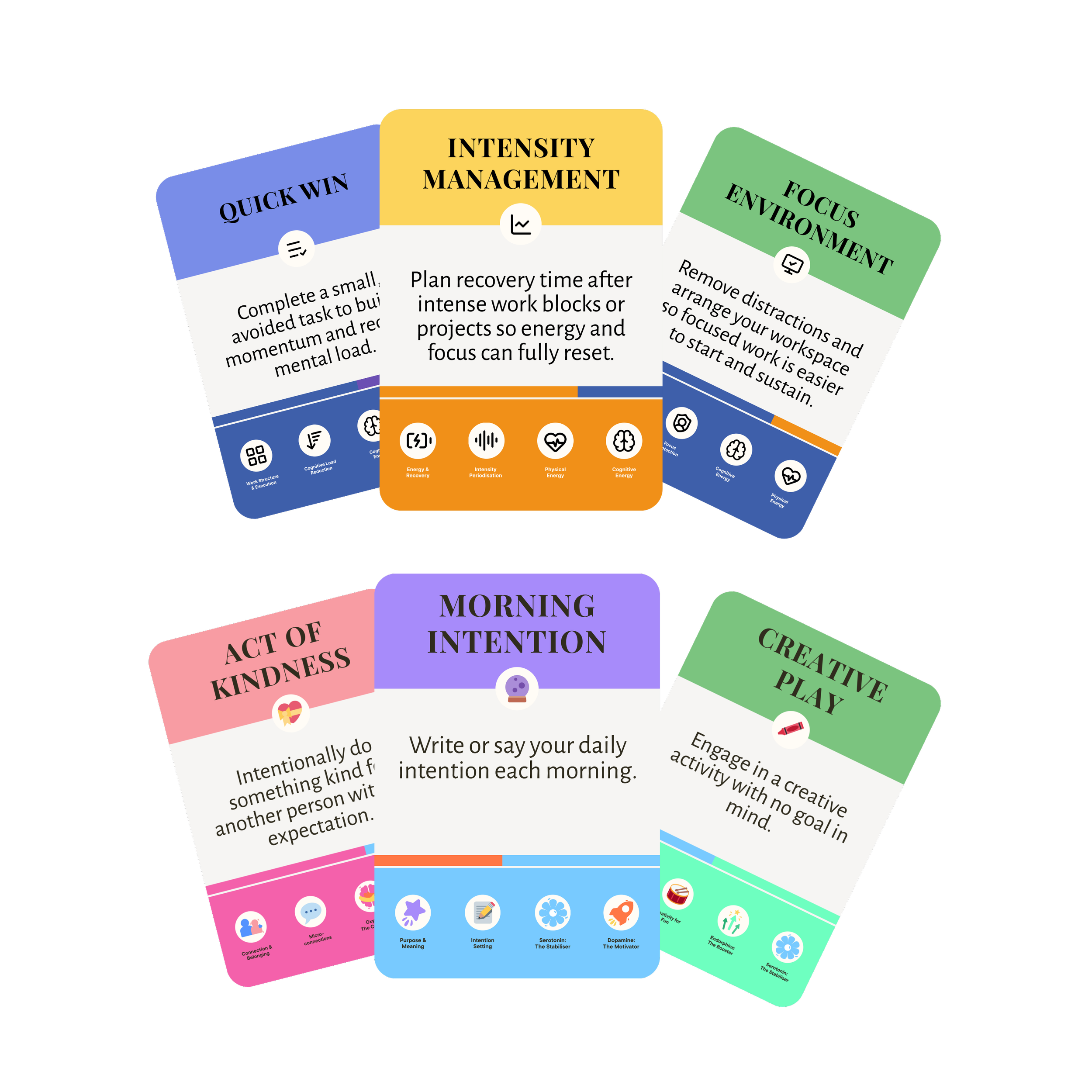 A physical deck of 48 foundation cards across the 6 wellbeing dimensions, 4 chemical explainers + your own Daily 3 tracker. Perfect as takeaways or team rituals. Great for front line and shop floor colleagues.